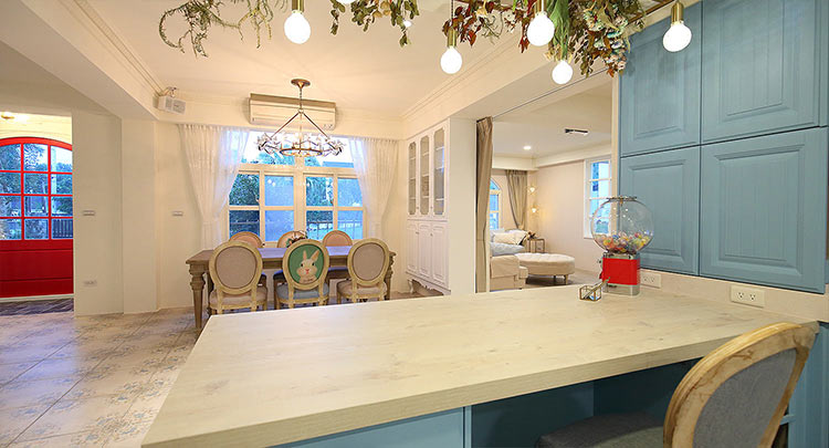 純白的牆面 搭配進口花磚、燈具,還有那淡藍色小廚房,是我們夢想一家人在一起生活的地方。