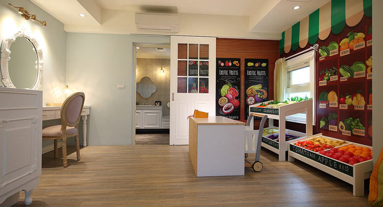 家家酒蔬果超市小孩兒的夢幻遊園地,獨居一樓的唯一房間,以歐洲街角蔬果店為設計概念,仿真的自然果物,讓寶貝們玩起扮家家的美好時光。